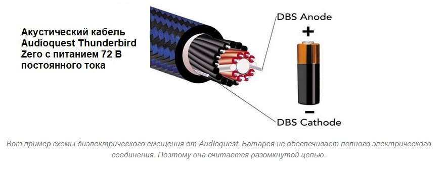 2. Заявляет о революционном прорыве в области кабельных технологий, основанном на поляризации или смещении диэлектрика с помощью батареи. (В частности, имеется в виду кабель Audioquest Thunderbird Zero с питанием 72В постоянного тока, см. рис вверху).