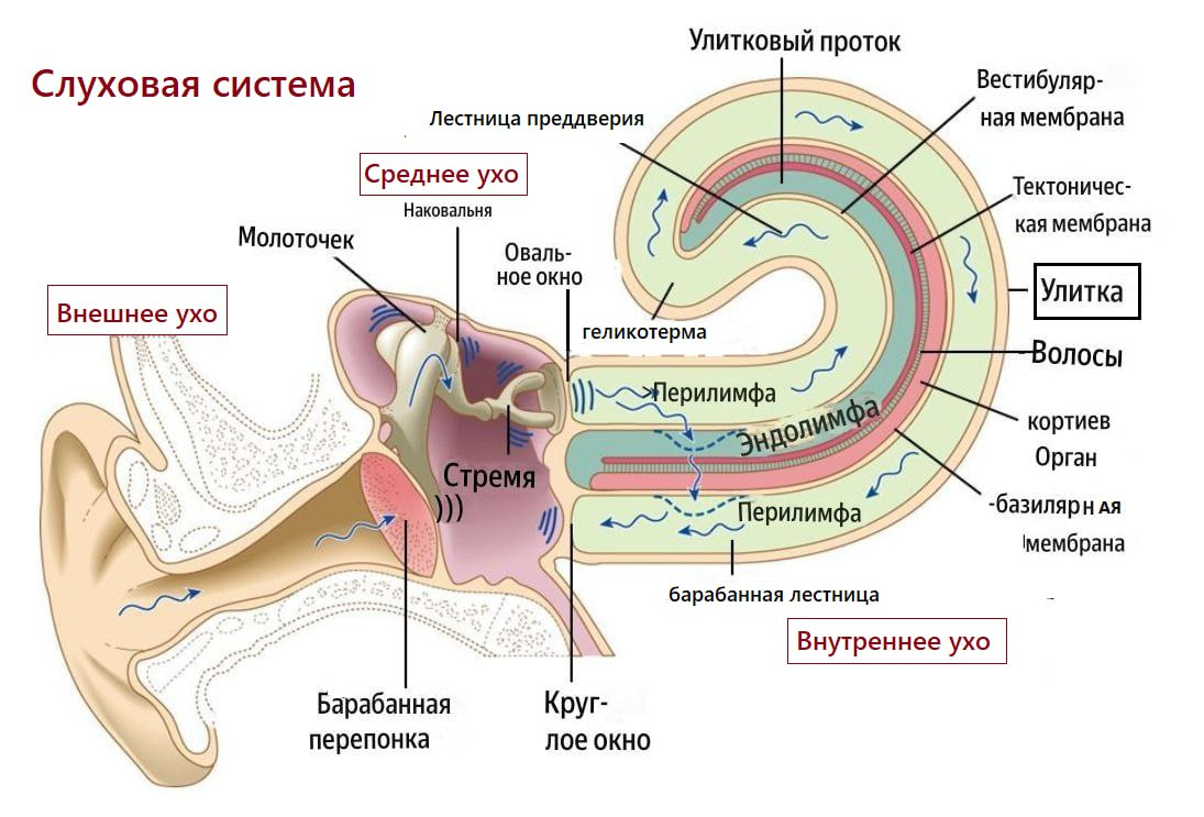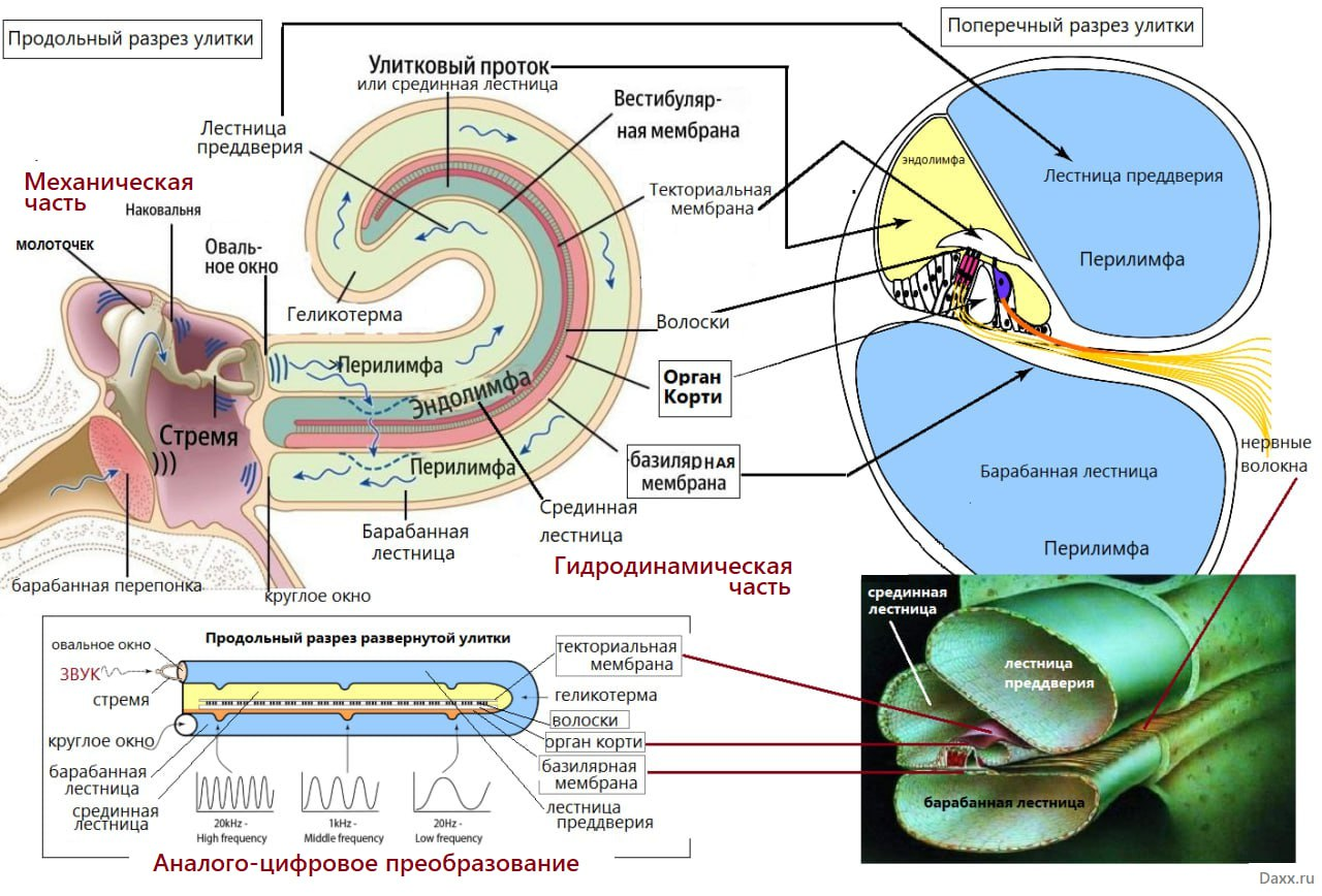Механические колебания, передаваемые от барабанной перепонки тремя косточками, продолжают свой пусть в улитке. Улитка, это трехслойная продолговатая мягкая трубка (или шланг) длиной 3,5см, которая свернута три раза подобно хвосту змеи.