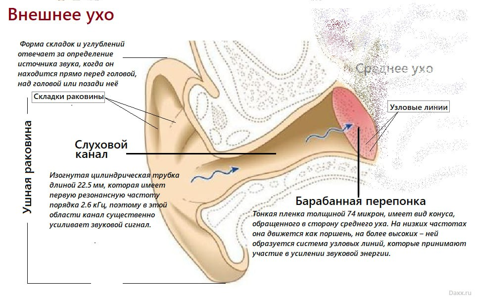 Внешнее ухо состоит их ушной раковины, слухового канала и барабанной перепонки. Внешние уши и голова – это компоненты внешней акустической антенны, которая соединяет (согласовывает) барабанную перепонку с внешним звуковым полем.