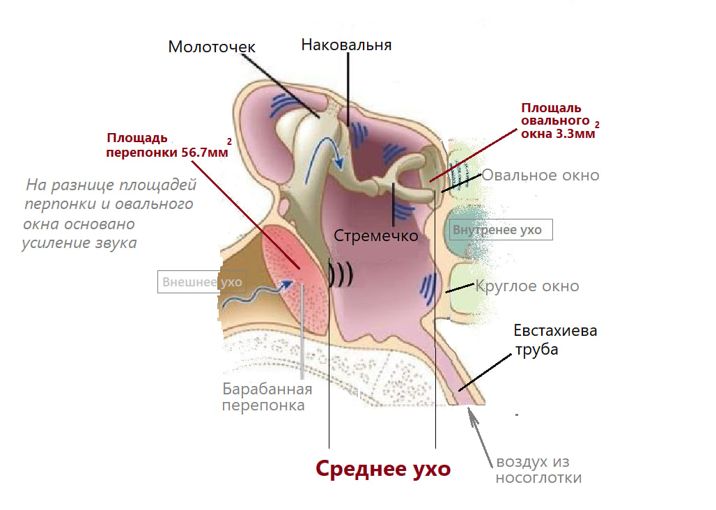 Площадь барабанной перепонки равна 56,7мм.кв., а площадь овального окна всего 3,3мм.кв.