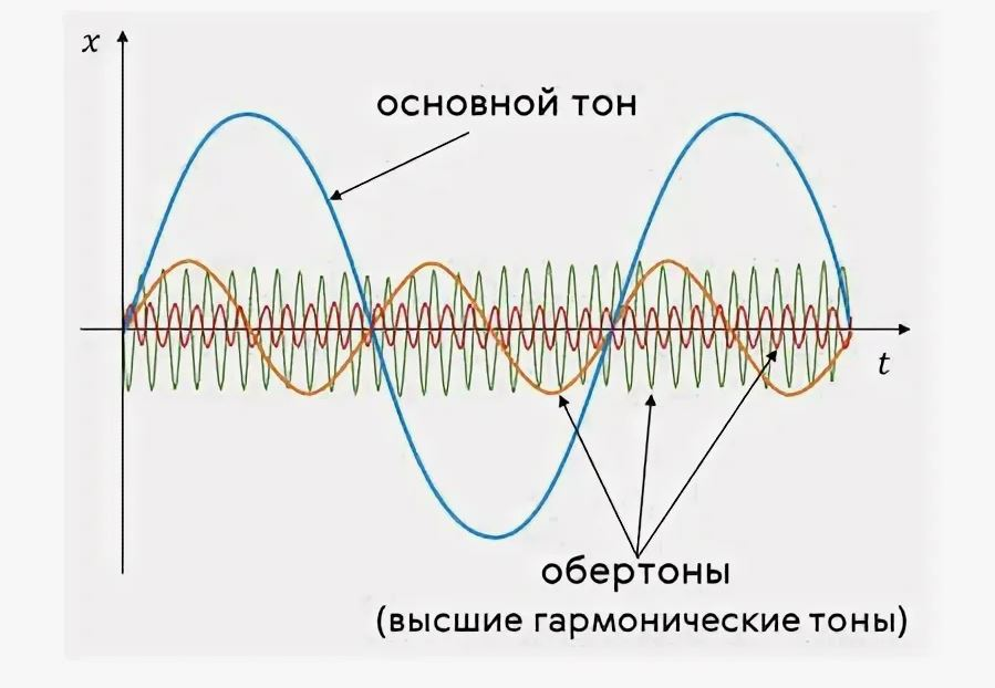 Существует параллельная терминология, которая введена физиками, — это гармоники. Тут немного сдвинуто: первая гармоника - есть основная частота, вторая гармоника равна основной частоте, помноженной на 2, что соответствует первому обертону, третья гармоника равна утроенной основной частоте, что соответствует второму обертону, и т.д.
