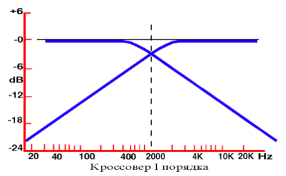 Проще говоря, кроссовер - это пара электрических фильтров. Допустим, кроссовер имеет частоту среза равную 1000 Гц. Это означает, что один из его фильтров срезает все частоты ниже 1000 Гц и пропускает только частоты выше 1000 Гц. Такой фильтр называют high-pass фильтром. Другой фильтр, пропускающий частоты ниже 1000 Гц называется low-pass,. Графически работа этого кроссовера представлена на рисунке 3. Точка пересечения двух кривых есть частота среза кроссовера равная 1000 Гц.