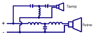 Кроссоверы второго порядка. Их также называют кроссоверами Баттерворта, по имени создателя математической модели этих кроссоверов. Конструктивно они состоят из одного конденсатора и катушки на твитере и одного конденсатора и катушки на низкочастотном динамике.