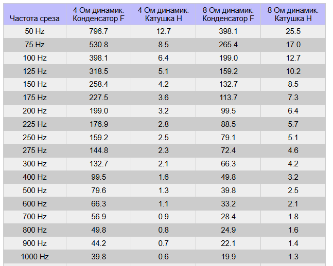 Как говорилось выше, пассивный кроссовер состоит из конденсаторов и катушек индуктивности. Для того, чтобы собрать пассивный кроссовер первого порядка необходимо иметь один конденсатор и одну катушку индуктивности. Конденсатор устанавливается последовательно на твитер (high-pass filter), а катушка последовательно на вуфер (low-pass filter). Номинальные значения индуктивности для катушки ((H - микрогенри) и емкости ((F - микрофарады) приводятся в таблице в зависимости от желаемой частоты среза кроссовера и сопротивления динамиков.
