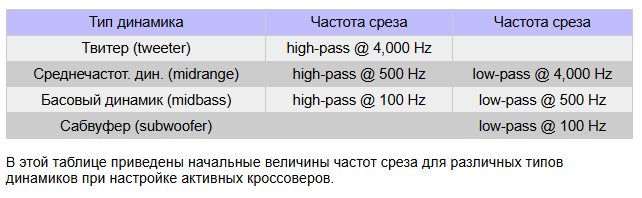 Самое важное в настройке кроссовера - это правильный выбор частоты среза. Если мы имеем трехполосный активный кроссовер, то значит перед нами стоит задача в определении двух точек (частот) среза. Первая точка определяет частоту среза для сабвуфера (low-pass) и начало среднечастотного диапазона для мидвуфера (high-pass).
