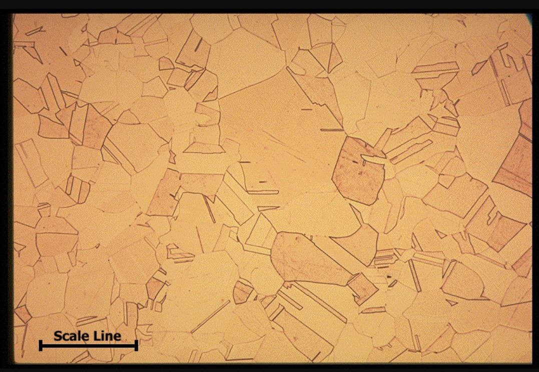 Бескислородная медь 99,99%: срез прутка. Масштаб 125 микрон. Марка C10100. Источник: Университет Флориды, США.