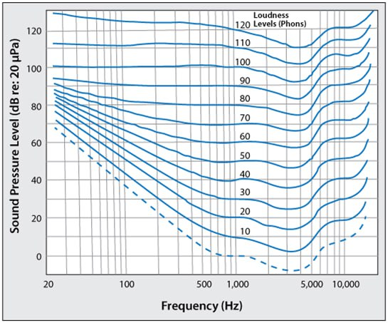 На диаграмме вы видите низкие ноты слева, высокие справа, а по вертикальной оси представлен их уровень. Из этого графика следует, что чем тише низкие высокие ноты, тем больше они должны быть усилены для того, чтобы ощущаться на той же громкости, что и средние частоты. Самая известная технология, использующая этот феномен это кнопка покачивания громкости на мультимедийных системах.