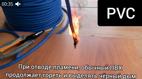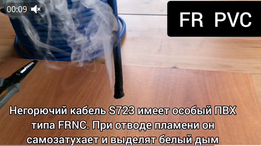 На видео (https://t.me/daxxcables/277) вы видите два типа акустических кабелей для систем оповещения, один из обычного ПВХ, который поддерживает горение с выделением черного дыма и второй из ПВХ с добавкой антимония триоксида (3% от массы ПВХ), который быстро затухает при отводе пламени горелки с выделением белого дыма.