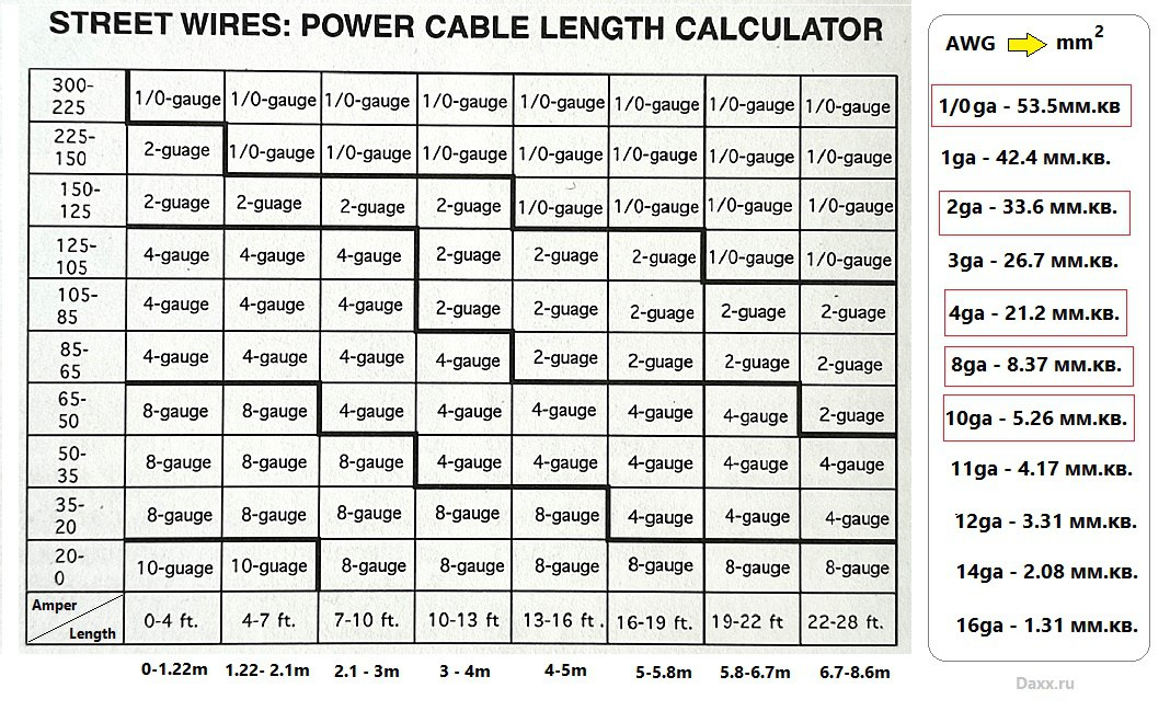 На всякий случай, печатаю известную в Car Audio таблицу от компании Street Wires для подбора сечения силовых кабелей в зависимости от силы тока и длины кабеля.