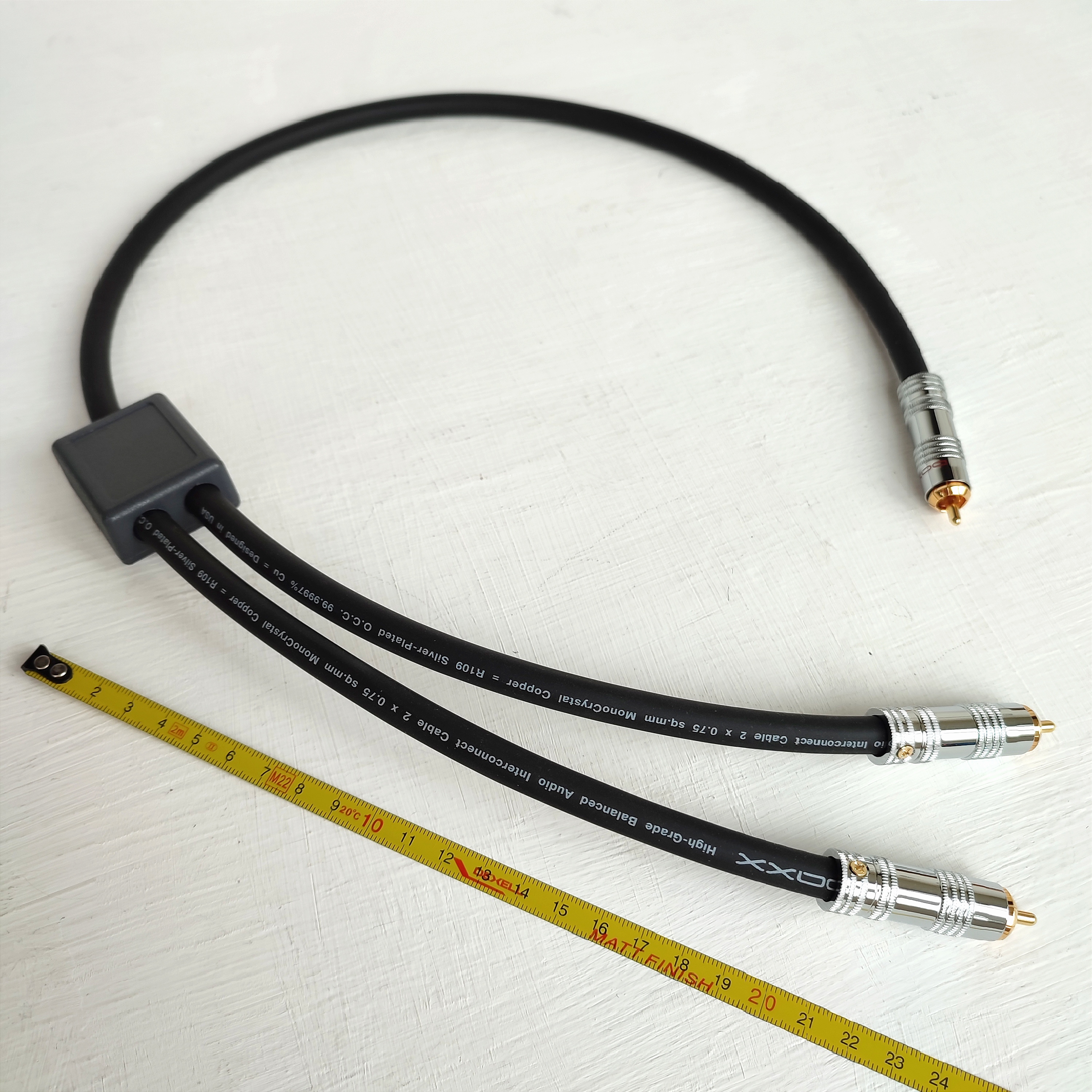 Тип: R109 - разветвитель 2RCA-на-1RCA;Сигнал: аналоговый аудио, небалансный;Конструкция: витая пара проводников с двойным экраном;Проводники: посеребренный монокристалл меди OCC (66 жил по d=0.12mm); cлой Ag3%;Степень очистки меди: 99,9997%; зонная плавка/очистка; IACS 102%Сечение: 2 х 0.75мм.кв;Диэлектрик: физически вспененный 3-слойный полиэтилен: Skin-Foam-Skin; ε=1.5-1.64;Экранирование: медная фольга и плетеный медный экран (96 жил по d=0,12мм);Заземление: экран припаян на землю в левом разъёме (по напр. текста на кабеле);Внешний диэлектрик: чёрный PVC, два слоя, D=9.0мм;LCR параметры при 10kHz: Сопротивление: Rs=0.024Ω/m; Ёмкость: Сp= 45.800pF/m;Индуктивность: Ls=0.953μH/m;Разъемы: RCA типа T99; 8-секционный с цанговым зажимом; бронза посеребренная, диэлектрик – тефлон; внешний баррель: воронение с лазерным нанесением; Производство: Тайвань;Поставка: один кабель типа Y (2RCA-1RCA);Бесплатный звонок: 8-800-700-5779Длина усов: всегда 0,25м; Выберите общую длину Y-кабеля внизу: