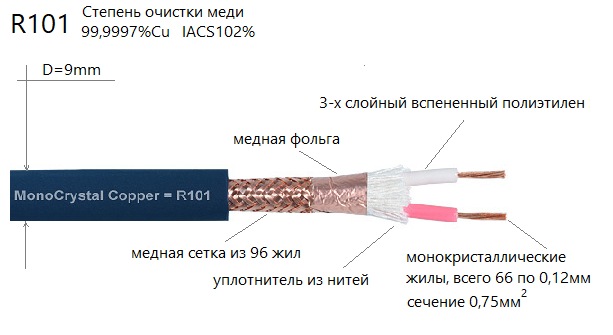 Тип: R101 - готовая стереопара + кабель заземления;Сигнал: аналоговый аудио, небалансный;Конструкция: витая пара проводников с двойным экраном;Проводники: монокристалл меди OCC (66 жил по d=0.12mm);Степень очистки меди: 99,9997%; зонная плавка/очистка; IACS 102%Сечение: 2 х 0.75мм.кв;Диэлектрик: физически вспененный 3-слойный полиэтилен; ε=1.5-1.64;Экранирование: медная фольга и плетеный медный экран (96 жил по d=0,12мм);Заземление: экран припаян на землю в левом разъёме (по напр. текста на кабеле);Внешний диэлектрик: синий PVC, два слоя, D=9.0мм;LCR параметры при 10kHz: Сопротивление: Rs=0.025Ω/m; Ёмкость: Сp= 45.800pF/m;Индуктивность: Ls=0.953μH/m;Разъемы: RCA типа T09; 8-секционный с цанговым зажимом; бронза позолоченная, диэлектрик – тефлон; внешний баррель: хромирование; Разъёмы изготовлены из качественной бронзы на высокотехнологичных металлообрабатывающих станках на Тайване. Разъемы имеют расщепленный центральный штекер и восьми-секционный обжим, который сжимается внешним цилиндром при накручивании. Данная конструкция полностью устраняет «дребезг» в системе и гарантирует очень надежное соединение. Контактные поверхности покрыты золотом для исключения коррозии.Производство: Тайвань;Поставка: одна стереопара + кабель заземления.Рекомендации: R101 кабель раскроет в вашей системе множество оттенков, скрытых ранее более простыми кабелями. Почерк у 101-го нейтральный и не привносит собственных красок. Все что новое вы услышите, - будет именно игра вашей системы, которая неожиданно заиграет открыто и глубоко. Образы в звуке хорошо очерчены и явственно наполнены. Прослеживаются тонкие нюансы и послезвучия. Ощущается смягченность и теплота монокристалла меди, которая скругляет остроту и резкость. Кабель подходит для виниловых проигрывателей высокого уровня и любых типов усилителей. Особенно хороша связка 101-го с винилом и ламповым усилителем, которая подчеркнет деликатность пластинки и организует высший уровень "теплого лампового" звука в вашей комнате. Плотный двойной экран закроет наглухо кабель от внешних шумов. Цанговые зажимы в разъёмах уберут дребезг. Прогрев не менее 100 часов. Если же вас интересует кабель, более чёткий (резковатый) и скоростной, который даст прирост фактурности и детальности с филигранной проработкой высоких частот, то советуем обратить внимание на посеребренный монокристалл меди R109. Аналог: R106 - более компактный для мини систем и наушников;⚡Возможно изготовление кабелей нестандартных длин по желанию покупателя.Модификации по металлам/звучанию:R109⚫ посеребр. монокристаллR101🔵 монокристалл медиR89 🔴 посеребренная медьR86 🟢 бескислородная медьКонсультации: 8-800-700-5779Где посмотреть: Москва, Земляной Вал 65Тестирование на дому: возможноДоставка и оплата: 👉в пункте CDEKЦена указана за готовую пару с заземляющим проводом